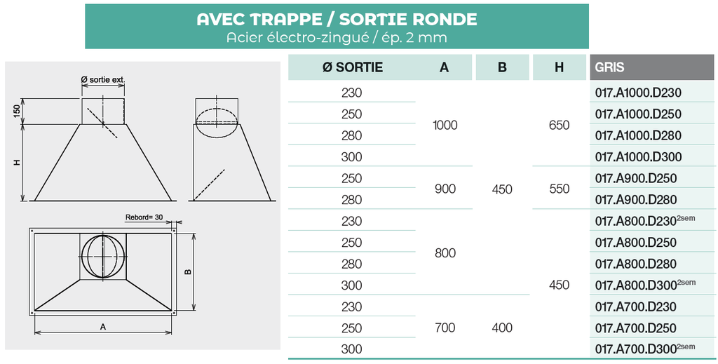 | Rèf. | Largeur | Diamètre du conduit / tubage | Prix | Quantité | Ajouter | |